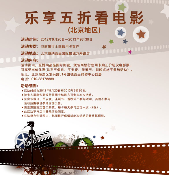 活动时间:2012年9月20日至2013年9月30日活动主题:[北京]北京信用卡 乐享五折看电影商户名称:博纳晶品国际影城活动群体:包商银行信用卡客户