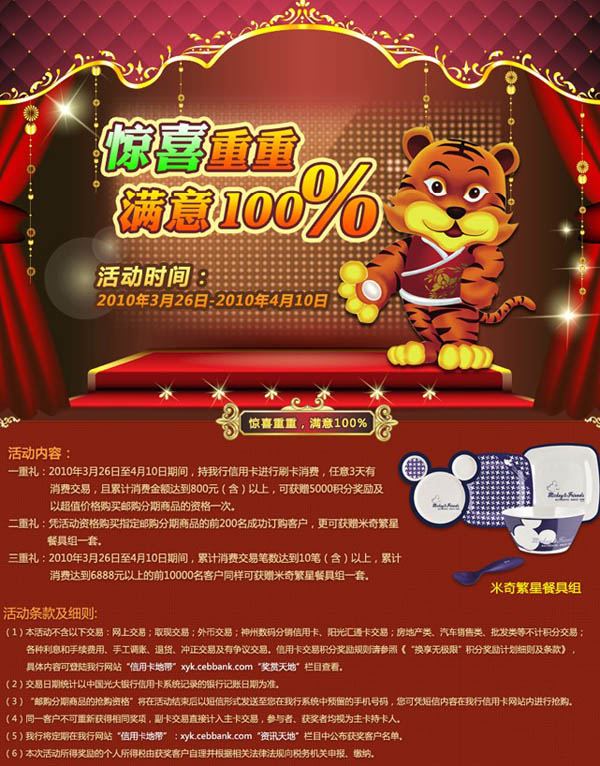 活动时间:即日起至2010年4月10日,[光大银行卡]“惊喜重重,幸运100%”活动