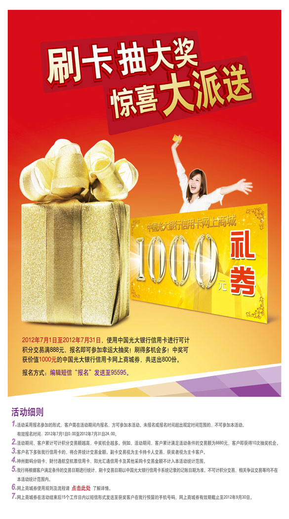 活动时间:2012年7月1日至7月31日活动主题:刷光大银行信用卡抽大奖,惊喜大派送