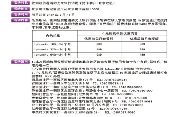 活动时间:即日起至2012年7月31日 活动主题:[北京]光大银行信用卡0元购机