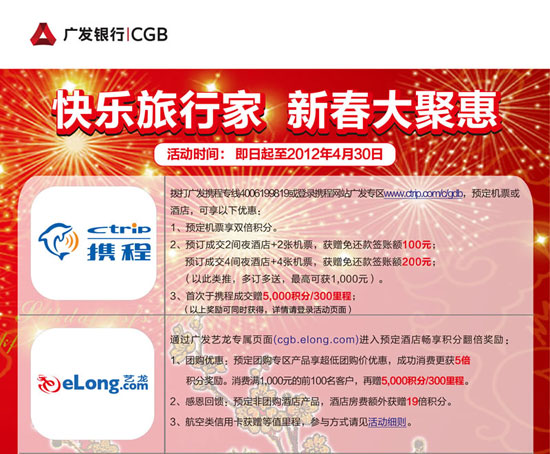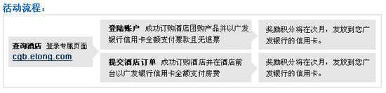 1.持卡人通过艺龙-广发商旅专属页面(cgb.elong.com)登录团购专区参与酒店团购活动,使用广发信用卡支付,享超低团购价优惠,成功消费更获5倍广发银行积分奖励。消费满1,000元的前1,00名客户,再赠5,000广发积分。