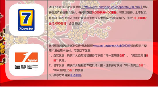 广发银行信用卡持卡人到至尊租车,活动期间在至尊租车全国任何门店包车与机场(接)送周一至周五车辆 “日租金8折”优惠,周六至周日5折。