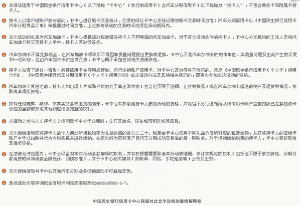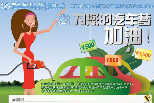 活动时间:即日起至2010年10月31日,民生银行信用卡为您的汽车梦加油!