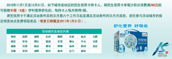 活动时间:即日起至2010年12月31日,刷民生信用卡,送伊利营养舒化奶!