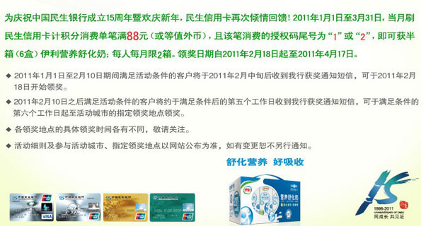 活动时间:2011年1月1日至2月10日,享对88 健康带回家—刷民生信用卡 送伊利营养舒化奶
