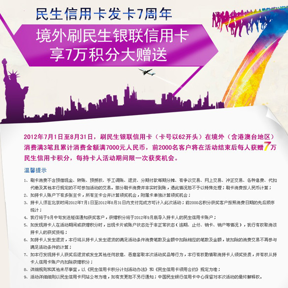 活动时间:2012年7月1日至8月31日活动主题:民生信用卡发卡7周年-境外刷民生银联信用卡,享7万积分大赠送