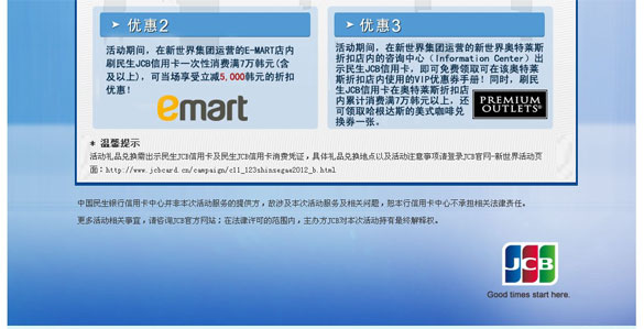 活动对象:民生JCB信用卡持卡人活动主题:[全国]刷民生信用卡尽享韩国购物节 活动时间:即日起至2013年3月15日