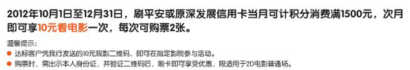 活动主题:[其他]平安银行信用卡看电影专享10元 活动时间:2012年10月1日-2012年12月31日