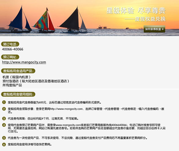 酒店兑换权益: 北京 酒店名称:北京国际饭店 星级:5星级 房型:标准大床房/双床房(可含双早) 住址信息:东城区建国门内大街9号 酒店适用时间:2013/4/1-2013/10/31 杭州 酒店名称:杭州奥克伍德酒店 星级:准5星级 房型:豪华单身公寓(可两人入住)(可含双早) 住址信息:杭州教工路28号 酒店适用时间:2013/4/1-2013/10/31(五一期间需自付100元入住) 酒店名称:杭州大酒店 星级:4星级 房型:豪华大床房/双床房(可含双早) 住址信息:杭州下城区延安路546号 酒店适用时间:2013/4/1-2013/10/31 天津 酒店名称:天津新桃园酒店 星级:准5星级 房型:高级大床房/双床房(可含双早) 住址信息:天津市河西区围堤道和广东路交口东北侧中豪世纪花园7号楼(广东路与中环线交口) 酒店适用时间:2013/4/1-2013/10/31 惠州 酒店名称:惠州凯宾斯基酒店 星级:5星级 房型:高级大床房/双床房(可含双早) 住址信息:惠城区云山西路2号(近惠州市政府) 酒店适用时间:2013/4/1-2013/10/31 海口 酒店名称:海南新国宾馆 星级:5星级 房型:豪华商务大床房/双床房(可含双早) 住址信息:海口市秀英区滨海西路111号(紧邻海边) 酒店适用时间:2013/4/1-2013/10/31 无锡 酒店名称:无锡金陵大饭店 星级:5星级 房型:高级大床房/双床房(可含双早) 住址信息:无锡县前东街1号 酒店适用时间:2013/4/1-2013/10/31 青岛 酒店名称:青岛国敦大酒店 星级:4星级 房型:高级房(可含双早) 住址信息:青岛市南区香港中路28号(香港中路家乐福对面) 酒店适用时间:2013/4/1-2013/10/31(青岛国际啤酒节,国际家电博览会,国际渔业博览会期间不适用) 厦门 酒店名称:厦门华美达长升大酒店 星级:4星级 房型:高级大床房(可含双早) 住址信息:厦门市思明区长青路431号(近松柏公园) 酒店适用时间:2013/4/1-2013/10/31(重大节假日并展会期间不适用) 丽江 酒店名称:老房子束河元年度假别院 星级:准5星级 房型:普通大床房(可含双早) 住址信息:丽江市古城区束河古镇中和路7号 酒店适用时间:2013/4/1-2013/10/31 深圳 酒店名称:深圳凯宾斯基酒店 星级:5星级 房型:豪华大床房/双床房 (可含双早) 住址信息:深圳市南山区后海滨路海德三道(漾日湾畔旁) 酒店适用时间:2013/4/1-2013/10/31(仅限周五、周六、周日入住) 东莞 酒店名称:东莞宏远酒店 星级:5星级 房型:商务大床房/双床房 (可含双早) 住址信息:东莞市南城区宏远路1号 酒店适用时间:2013/4/1-2013/10/31