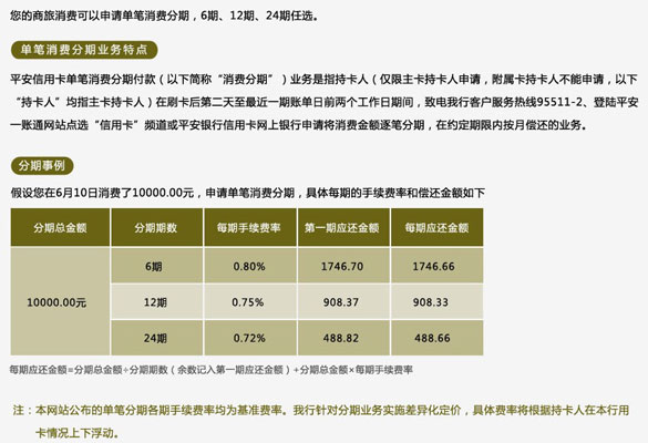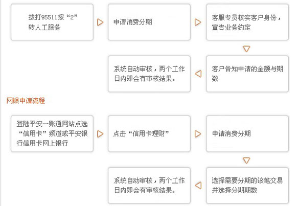 单笔消费分期业务介绍 平安信用卡单笔消费分期付款(以下简称“消费分期”)业务是指持卡人(仅限主卡持卡人申请,附属卡持卡人不能申请,以下“持卡人”均指主卡持卡人) 在刷卡后第二天至最近一期账单日前两个工作日期间,致电我行客户服务热线95511-2、登陆平安一账通网站点选“信用卡”频道或平安银行信用卡网上银行 申请将消费金额逐笔分期,在约定期限内按月偿还的业务。 单笔消费分期业务特点 自由分期:持卡人可自由选择申请3期、6期、12期、18期或24期,每月不限申请单笔消费分期的次数,单笔消费在100000元以下均即可申请,申请成功后,首期分期金额和手续费在本期账单中产生,满足持卡人大额消费需求,直接减轻当期还款压力 申请便捷:持卡人可通过拨打平安银行客服电话或登陆平安银行信用卡网银申请 快速审核:持卡人在规定的日期内申请 单笔消费分期,当日申请当日审核,两个工作日内即会有审核结果 单笔消费分期申请流程 申请流程 电话申请流程