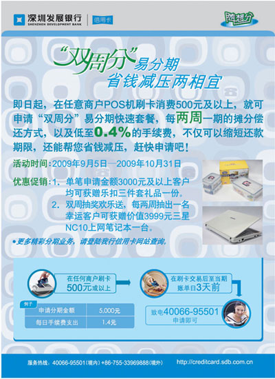 活动时间:即日起至2009年10月30日,申请“双周分”易分期,乐扣套装快乐送!
