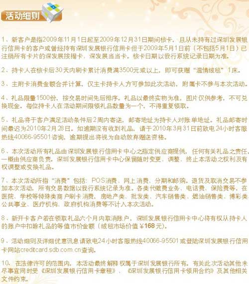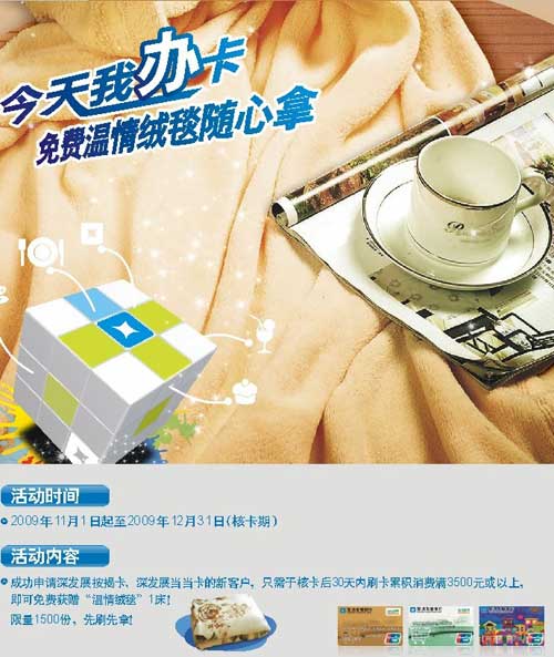 活动时间:即日起至2009年12月31日,深发银行【新卡有礼】今天我办卡,免费温情绒毯随心拿