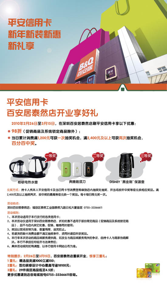 活动时间:即日起至2010年3月15日,[深圳]刷平安信用卡,百安居泰然店重装开业惠礼全归你