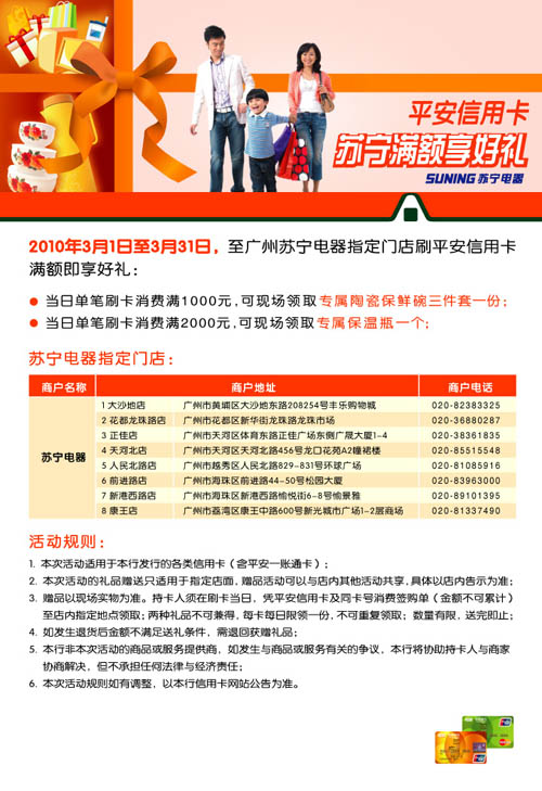 活动时间:即日起至2010年3月31日,[广州]平安信用卡,苏宁满额享好礼