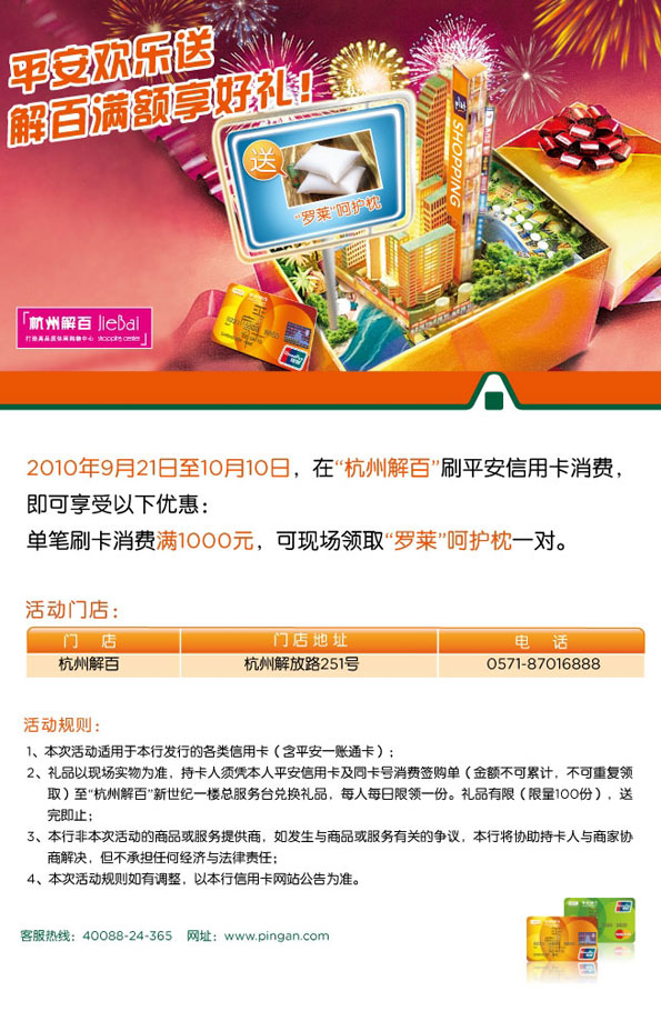 活动时间:即日起至2010年10月10日,[杭州]平安欢乐送,解百满额享好礼