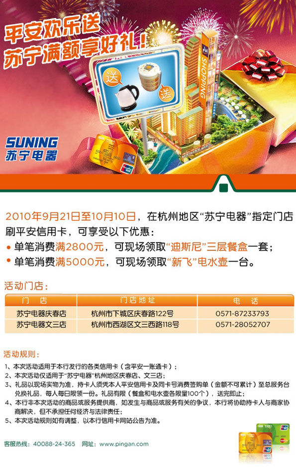 活动时间:即日起至2010年10月10日,[杭州]平安欢乐送,苏宁满额享好礼