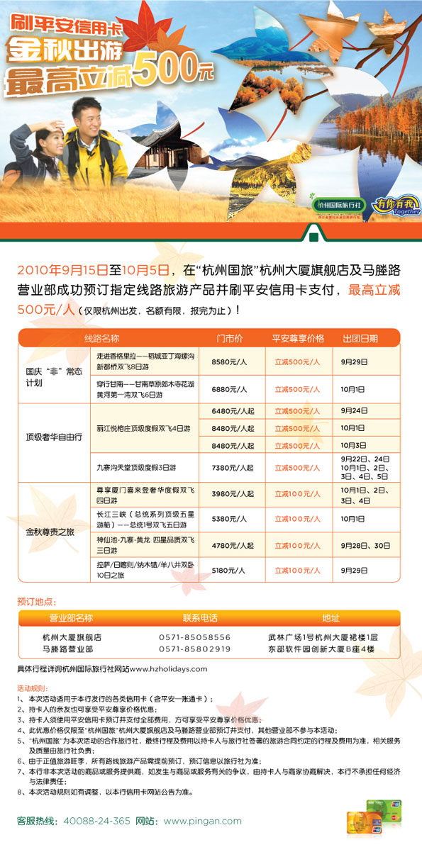 活动时间:即日起至2010年10月5日,[杭州]平安信用卡,金秋出游最高立减500元