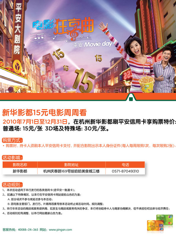 活动时间:即日起至2010年12月31日,【平安银行信用卡】新华影都15元电影周周看
