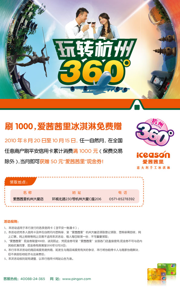 活动时间:即日起至2010年10月15日,[杭州]平安信用卡,玩转杭州360°,刷1000,爱茜茜里冰淇淋免费赠