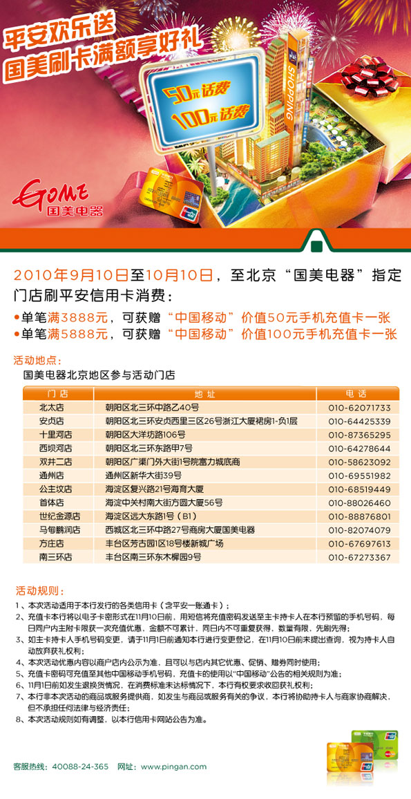 活动时间:即日起至2010年10月10日,[北京]平安欢乐送 国美金秋购物季