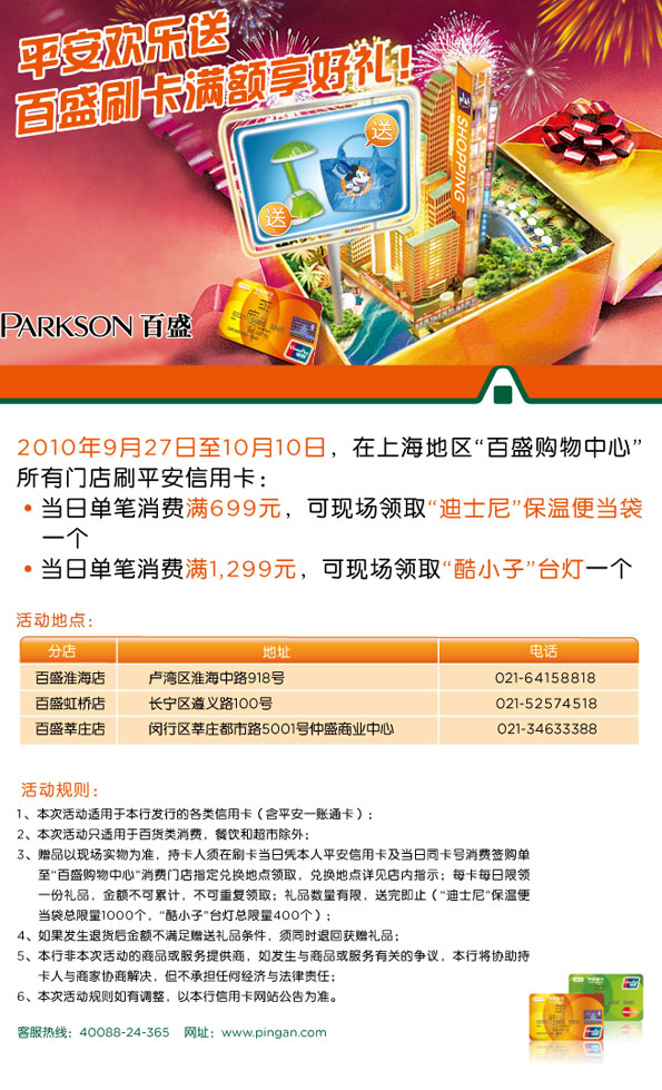 活动时间:即日起至2010年10月10日,[上海]平安银行信用卡欢乐送,百盛满额享好礼