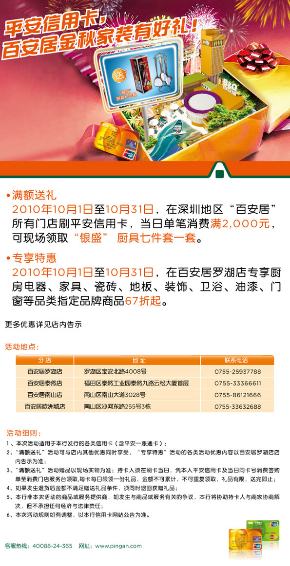活动时间:即日起至2010年10月31日,[深圳]平安信用卡 百安居金秋家装有好礼!
