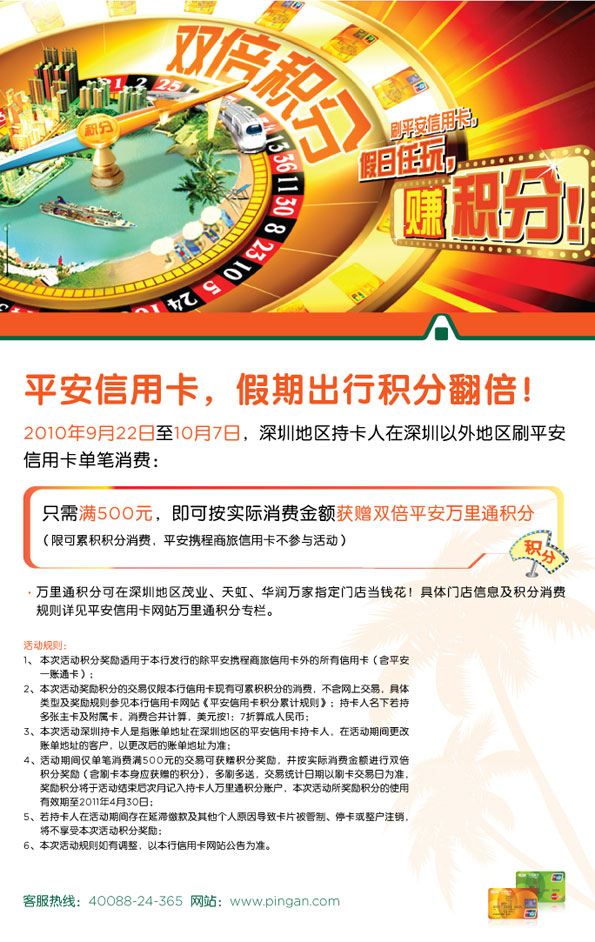 活动时间:即日起至2010年10月7日,[深圳]平安信用卡―假期出行积分翻倍!