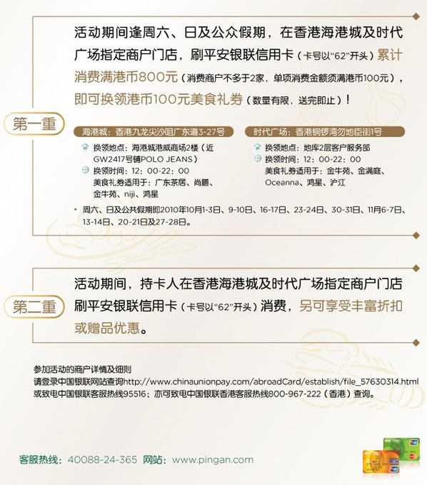 活动时间:即日起至2010年11月30日,[平安银行信用卡]时尚消费,触发美馔优惠