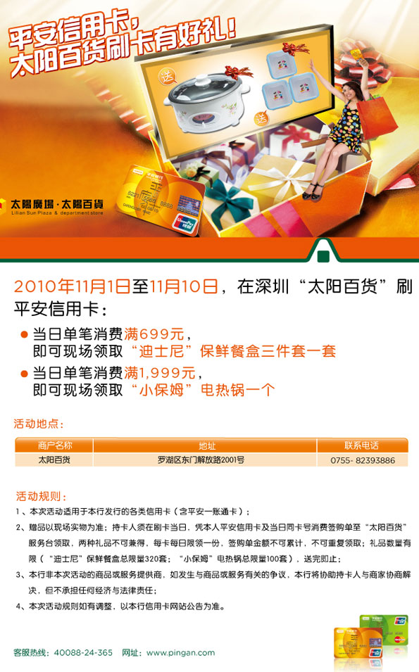 活动时间:即日起至2010年11月10日,[深圳]平安信用卡,太阳百货刷卡有好礼!