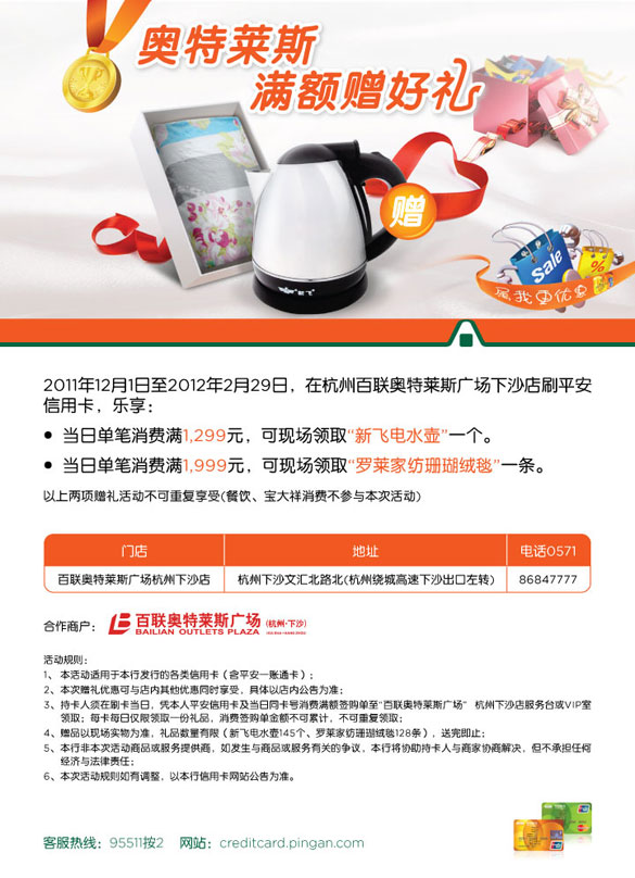 即日起到2012年2月29日,[杭州]平安信用卡 奥特莱斯好礼升级