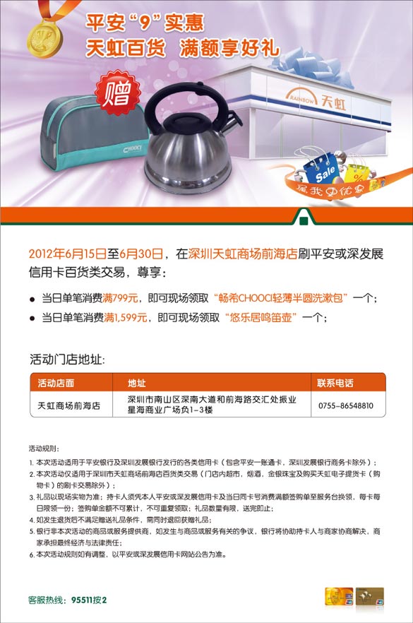活动时间:即日起至2012年6月30日 活动主题:[深圳]平安卡9实惠,天虹百货满额享好礼