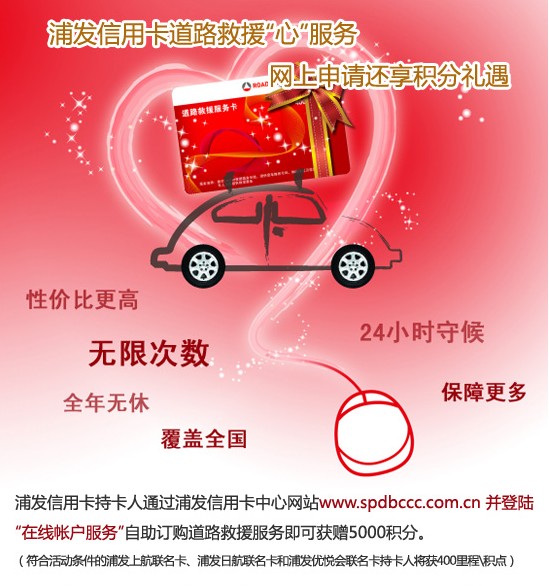 活动细则 1、 本活动时间为2010年1月8日至2010年2月28日,以成功交易日为准。该道路救援服务提供商为路华救援(北京)有限公司; 2、 持卡人须通过浦发信用卡中心网站自助订购道路救援服务并使用指定浦发信用卡全额支付服务费方可参加本活动。浦发信用卡标准白金卡、公务卡不参与此活动; 3、 符合活动条件的浦发上航联名卡、浦发日航联名卡和浦发优悦会联名卡持卡人将获400里程\积点。 4、 持卡人使用浦发信用卡以上述方式为多辆车订购道路救援服务,所赠积分\里程\积点可累积; 5、 积分将于活动结束后次月赠予,积分使用适用《上海浦东发展银行信用卡积分活动规则》。若持卡人退订该项服务,所赠积分将自动扣回; 6、 逾期账户和销户账户不参加此次活动; 7、 在法律法规许可的范围内,本次活动的最终解释权属于上海浦东发展银行信用卡中心。