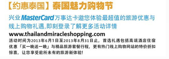 活动主题:[全国]兴业银行信用卡【约惠泰国】泰国魅力购物节 活动时间:2013-06-01 至2013-08-31