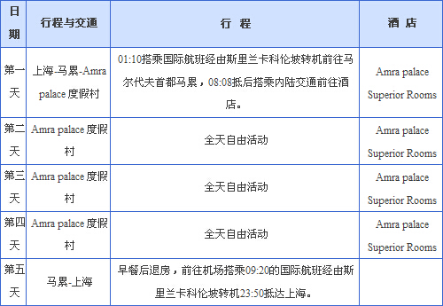 1.上海往返马尔代夫,斯里兰卡航空经济舱团队机票(含税)或如选择新加坡航空经济舱(需加1500元/人和马尔代夫美佳航空直飞经济舱(需加1000元/人);