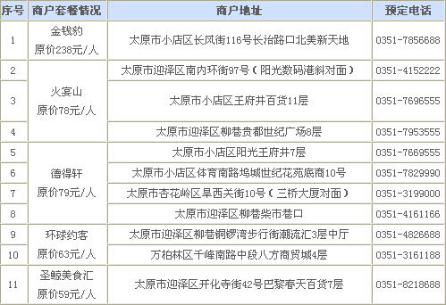 活动时间:2014年9月16日至12月31日期间每周二(活动日共计16天) 活动对象:太原地区兴业银行信用卡持卡客户 活动内容:活动期间的每周二,客户持兴业银行信用卡至指定商户自助餐餐厅消费(需提前致电商户预约,每周二上午10点开始接受当日活动电话预定,不接受提前预定和现场预定),享自助餐五折优惠。 每人每个活动日限享2个半价优惠名额,每月限享4个半价优惠名额次优惠,每家门店每个活动日天限60人次优惠名额,数量有限,先订先得。 活动商户信息: