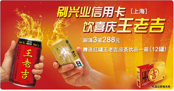 2010年9月27日至2010年11月28日,持兴业银行信用卡于境内计积分的商户刷卡消费满3笔,且每笔金额满288元,即可于10月9日起的每周六、周日,凭信用卡及签购单原件到指定兑换网点兑领红罐王老吉1箱(12罐装)。活动期间,每卡每日限领1箱,每卡每月限领2箱,每人限领10箱。