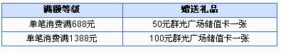 1、活动一的交易时间以签购单上打印时间为准,需在交易当天进行领取;礼品兑换时间为商场营业时间,兑换地点位于群光广场8楼卡友服务中心;每卡每天仅限参与1次,活动期间每卡仅限参与2次;每日不限50元、100元,两个等级合计限赠100份,按照礼品发放顺序,先到先得,满额即止;活动期间限500份,送完即止。