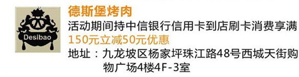 活动时间:2012年10月12日至2012年11月12日活动主题:[重庆]中信银行信用卡 精彩杨家坪 德斯堡天天享美食