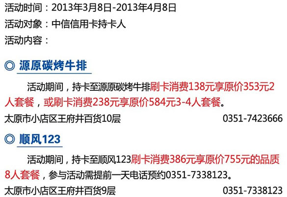 活动主题:[太原]喜刷中信银行信用卡享乐惠 活动日期:2013/03/08-2013/04/08
