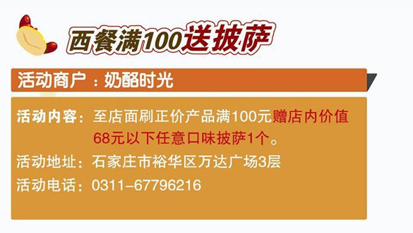 活动主题:[石家庄]精彩中信银行信用卡奶酪时光满100送披萨活动时间:2013/02/25-2013/03/25