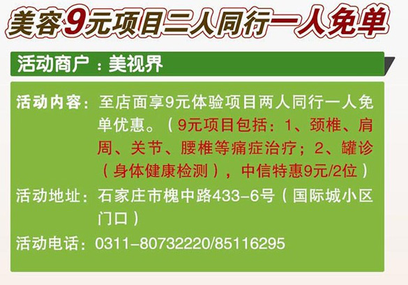 活动主题:[石家庄]精彩中信银行信用卡美视界9元美容项目 活动日期:2013/02/25-2013/03/25