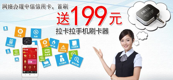 活动主题:[全国]网络办理中信信用卡,首刷送拉卡拉手机刷卡器 活动日期:2013/06/13-2013/07/13