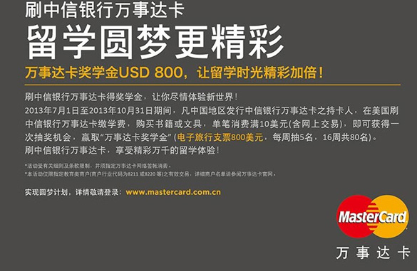 活动主题:[全国]刷中信万事达卡得奖学金,享受精彩万千留学体验活动日期:2013/07/01-2013/10/31