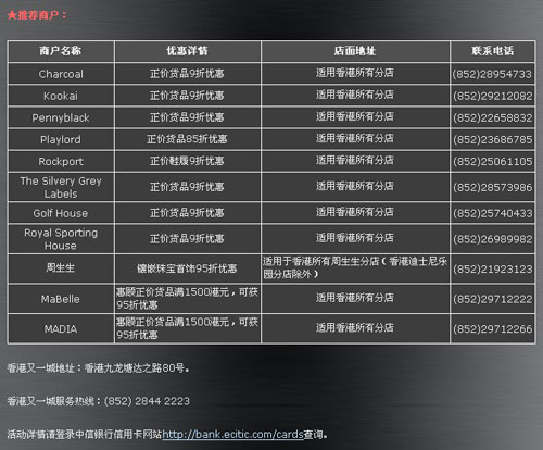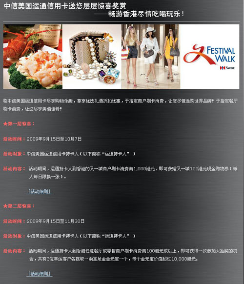 活动时间:2009年9月15日至2009年10月7日,中信美国运通信用卡送您层层惊喜奖赏——畅游香港尽情吃喝玩乐!
