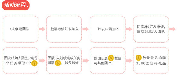 活动内容:通过微信参与“开心团团赚”活动,组建3人团队,完成任务赚取,按团队合计的总量进行排名竞赛,最多的前3,000团即可每人获得壕礼一份