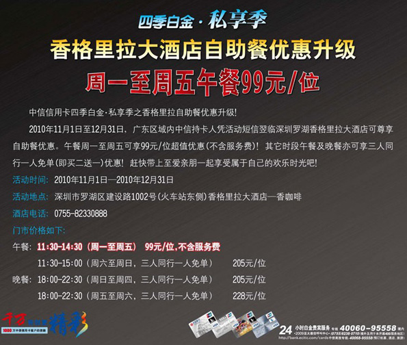 活动时间:即日起至2010年12月31日,【中信银行信用卡】四季白金·私享季 香格里拉自助餐优惠升级