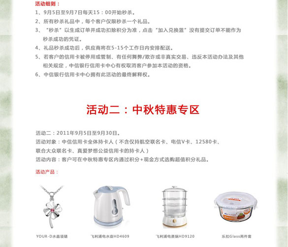 活动时间:即日起至2011年9月30日,[全国]中信卡秒亮中秋 九分秒杀